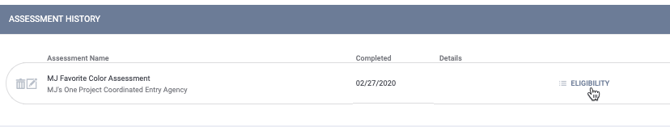 From the ASSESSMENTS tab in the client record, locate the saved assessment in the ASSESSMENT HISTORY section. Click ELIGIBILITY.