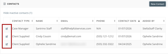 For each contact, there is an "Edit" icon to the left of each contact listed on the CONTACTS page (regardless of whether the contact was added in Clarity or the Customer Portal).