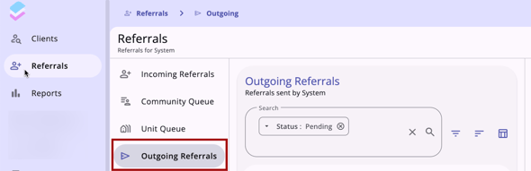 Users with Referrals tab access can view and manage the agency’s outgoing referrals in the new Clarity interface. From the global Referrals tab on the primary navigation menu, users can click on the Outgoing Referrals tab.