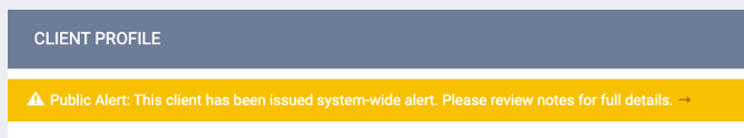 Public Alerts appear as a gold banner across the top of the Client Profile.