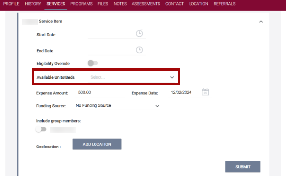 When a service is created from the global-level SERVICES tab, or within the program-level Services tab, the housing INVENTORY unit/bed can be connected when there is an active Daily Attendance Service connected.