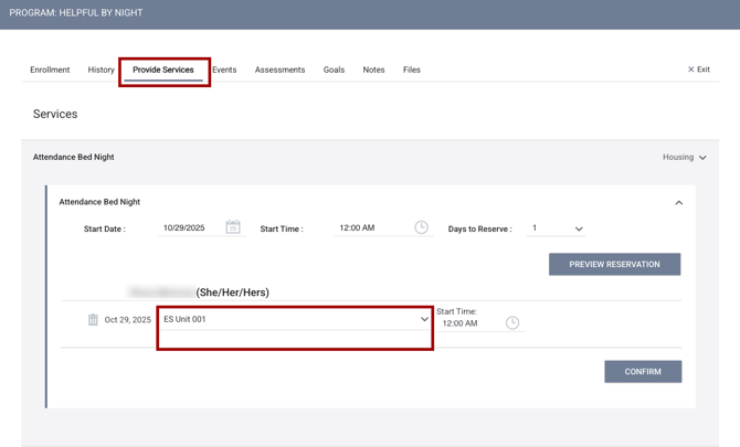 The ability to manage daily attendance services and reservations for service-connected housing INVENTORY units/beds is now available in the client’s global-level SERVICES tab or program-level Services tab.